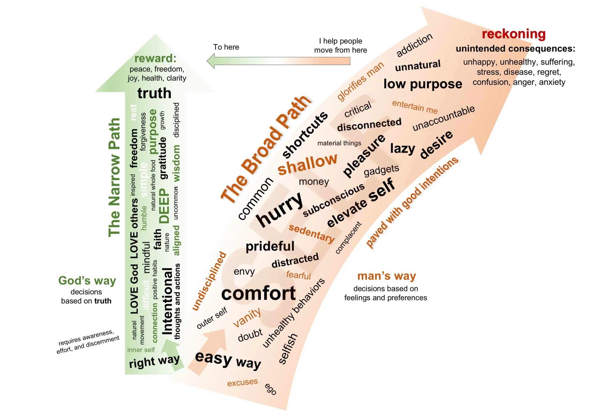 The Narrow Path is more than a term I use to describe my coaching. It is an intentional way of life built on a foundation of God given natural laws and truths. When we quit fighting our own nature and surrender to the universal truths that God gave us for living, the result can be a beautiful life filled with peace, health and purpose. An intentional life built on these truths prioritizes diet, exercise, sleep, stress reduction, purpose, on a strong foundation of deep connections with God, with others, and with His creation. It is aligned with God’s plan for how we are created to live and who we are created to be. Most of us have lifestyles that are disconnected from how God created us to live in ways that we feel deeply yet sometimes struggle to put into words. My purpose is to inspire and encourage as many believers as possible to take this journey. To take the more difficult path and learn together what it means to live an intentional life aligning what we do with what we believe. To take The Narrow Path.